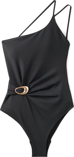 MANGO Asymmetric Open Back O-Ring One-Piece Swimsuit, Main, color, Black