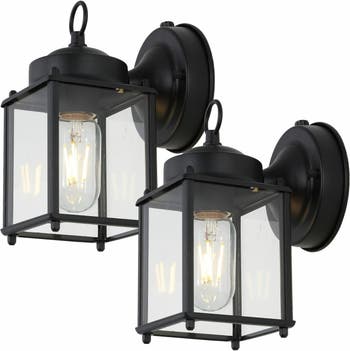 Inspired by traditional and coastal lantern designs, our pair of small outdoor wall lights is the perfect update for your porch or patio. This classic carriage lantern is accented by a traditional ring finial and round backplate, with clear glass panes and a bright LED bulb. Use these versatile light fixtures at a modern farmhouse, country cottage or elegant traditional home.
