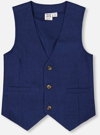 He'll look like the perfect little gentleman in our Sleeveless Vest Navy Blue. With four front buttons and a welt pocket, this classic vest makes it easy to create a polished, sophisticated look. Team it with a matching pant or short for head to toe coordination!