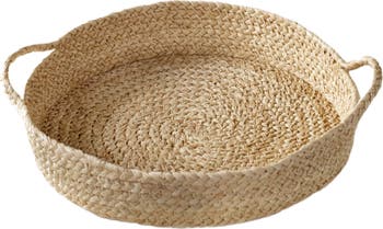 This handwoven tray is coastal inspired and full of texture and the perfect addition to your home decor. 14" W x 3" H Natural color Made from locally sourced, hand braided raffia Sturdy and lightweight design Double handles The Raffia Tray is a perfect housewarming gift that can be used as a lovely accent to a coffee table, kitchen island, or to treat yourself to breakfast in bed!