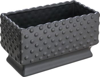 This black ceramic hobnail planter is a blend of vintage charm and modern elegance, featuring an intricate hobnail texture, scalloped edge, and playful polka dots. It's perfect for showcasing a variety of plants, from vibrant blooms to greenery. The planter is versatile and can be placed on windowsills, mantelpieces, or bookshelf, adding personality and timeless beauty to any space. Crafted from durable ceramic, it's a cherished addition to the home for years to come. The planter is spacious and deep, suitable for indoor or outdoor use and can match any décor style, from cottagecore to vintage to farmhouse. The planter measures 11.25 inches in length, 5.75 inches in width, and 6 inches in height. It's a perfect gift for those who love ceramic and hobnail decor.