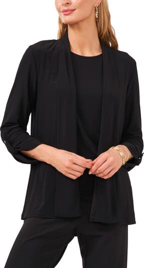 A billowy cardigan in soft, stretch jersey lends a layer of warmth and refined style to any desk-to-dinner look.