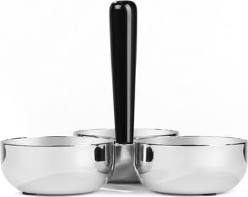 A lacquered handle makes serving nuts or other nibbles easy in this three-compartment bowl crafted from polished Nambé alloy.