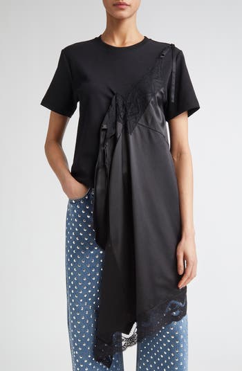 Known for their twisted tailoring, the New York design duo gives underpinnings top billing in this deconstructed T-shirt with a glossy satin panel trimmed in scalloped floral lace.