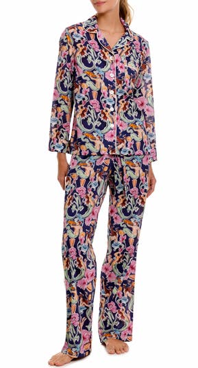 A pop of contrast piping highlights the whimsical floral print on lightweight cotton pajamas that will ensure lasting comfort while lounging at home or nodding off to sleep.