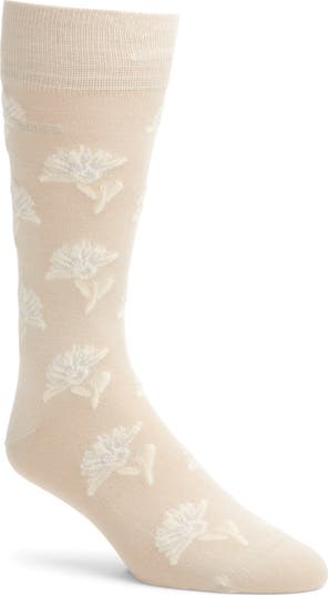 Subtly textured flowers float against the pale cotton-blend knit of dress socks that are perfect for relaxing a semiformal or sunny-day outfit.