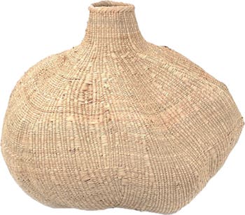 These Garlic Tonga Sculptural Baskets are made entirely of Ilala palm leaves in rural Bulawayo, Zimbabwe by women of the Ndebele. The weaving is a traditional technique that has been passed along from one generation to the next. Women gather to weave and connect with each other under the shade of large trees with their children playing nearby. Each weaver infuses her own touch in these baskets, so each one is unique in pattern and shape - no two are identical, which makes each basket truly one of a kind. Use these gorgeous baskets to decorate any space that needs a warm, handmade touch. Amazing on their own or with dried flowers, stems or branches. The smaller ones can go on tabletops as centerpieces or shelves, while the larger ones look great on the floor in a corner, by a bed or a credenza. They look best in groups of different sizes for a fuller effect. The baskets are measured using a soft tape measure. The tape is run from the center of the base of the basket, around the curve of the bowl, then up the neck. Because of the wide variety of shapes of these baskets, the measurement is a CONTOUR measurement, not a straight LxWxH.