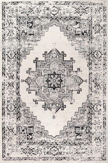 The diamond-shaped medallion in the center of this rug's design recalls ancient geometric rugs. The neutral ivory and charcoal gray color scheme adds a modern update to a classic design. With its Bohemian-inspired, minimalist design this rug would be perfect for a dining room, living room, entry or bedroom.