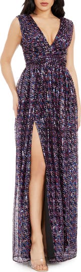 Soft pleats lend graceful movement to this exquisitely sparkling sequin-covered gown designed with a deeply dipped neckline and a stem-showing side vent.