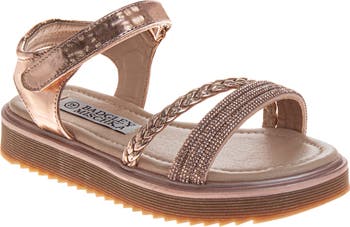 Metallic straps and rhinestones lend lots of shine to this kid-size platform sandal that will have them sparkling with each step.