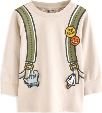 The trompe l'oeil rucksack on this long-sleeve cotton T-shirt is even more fun with the addition of kid-pleasing patches to texture the look.