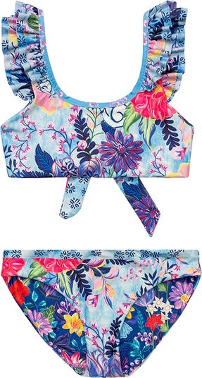 Fluttery sleeves add a little frill to this two-piece swimsuit complete with reversible bottoms to give your budding trendsetter options.