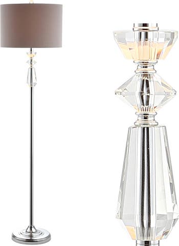 Perfect for rooms with a moody, neutral color scheme in need of a pop of glamour, this floor lamp delivers a lot of style in a classic shape. Accented with a trio of faceted crystal objects at the neck of the base, it is completed with a grey drum shade and chrome body. The crystal finial ties the look together and is seemingly illuminated when the bulb is lit.