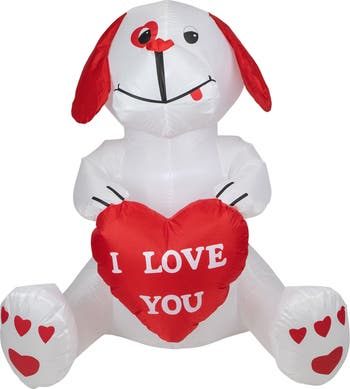 This inflatable, Valentine's Day pup offers a sweet sentiment. I Love You! Pre lit with clear LED lights, it gives the ideal amount of glow. The self inflating features makes set-up a breeze. Product Features: Pre-lit with 3 clear LED lights Weather resistant polyester Self inflates in minutes Blower included Collapses quickly for easy storage Weighted bottom for stability Additional Product Features: UL certified and approved for outdoor use Transformer included Class 2 power supply UL 600MA adaptor 0.5A fan 72" black lead cord Ground stakes and tether included Dimensions: 48"H x 48"W x 42"D Material(s): polyester