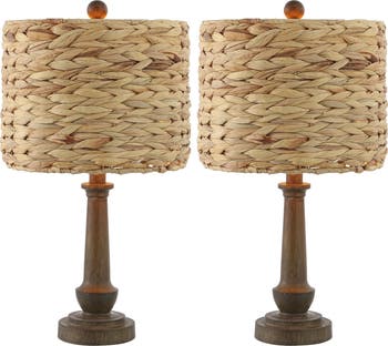 This bohemian table lamp has a farmhouse inspired tapered base. The rustic lamp consists of a resin base and water hyacinth shade. The lamp, which comes in a set of two, will add a touch of traditional decor to any space.
