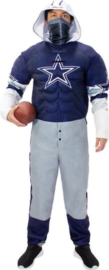 Transform into a Dallas Cowboys player with this Game Day costume in team colors. The bodysuit features padded faux muscles, official Dallas Cowboys graphics and a zipper closure for easy dressing. Plus, polyester material creates a soft feel for hours of comfortable wearing.