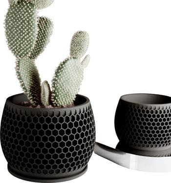 Sizes: Large: Height: 6 inches | Width: 8 inches Medium: Height: 4.5 inches | Width: 6 inches Small: Height: 3 inches | Width: 4 inches Looking for something custom? Feel free to reach out for personalized sizes or colors. Modernized design We created the HONEYCOMB planter to showcase the elegance and structural beauty found in nature’s designs, particularly the honeycomb's geometric precision. Its intricate hexagonal texture adds a layer of sophistication and visual intrigue, making it a striking yet refined home for your plants. The drip tray/saucer is custom-fitted and designed to perfectly complement the planter. Made from 98% Plant-Based Materials | BioPlastic & Wood Fibers
