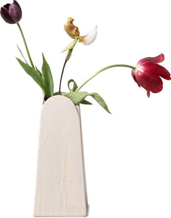 Subtle drips of intentionally wabi-sabi glaze drizzle the sides of this sculptural ceramic vase that angles upwards to its curved-tulip-inspired top that gently props up your favorite select stems.