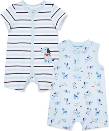 Be prepared for an outfit change with this set of cotton rompers featuring precious puppies and classic stripes—each with plenty of buttons or snaps.