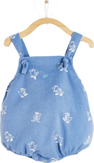 Keep your little one cool and stylish with this charming romper! Made from soft blue cotton, it features our exclusive Raphael collection print, showcasing cute white animal friends ready for summer adventures, complete with sunglasses, life preservers, hats, and more! Adjustable straps tie at the front for a comfortable fit, while elasticized leg openings and snap closures ensure easy diaper changes. Perfect for warm weather fun!