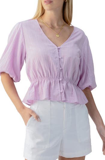 Airy puff sleeves frame this textured cotton-dobby V-neck top punctuated with a flouncy peplum.