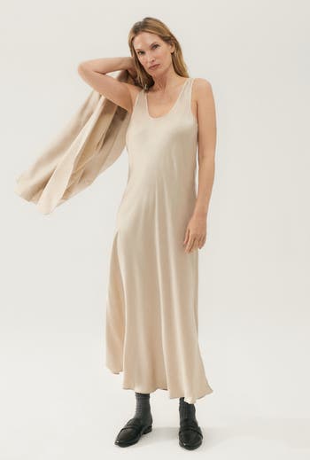 Silk Laundry Scoop Neck Dress in silk satin, tailored with a bias cut for a regular fit. Sleeveless with a scoop neckline, flowing into an ankle-length hem.