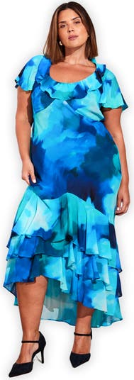 This dress combines style and comfort with its beautiful blue floral design, perfect for any special occasion, featuring flattering tiers and an easy fit.