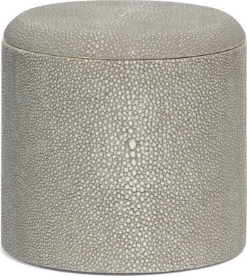 Stash away all of your extra toiletries inside this round canister crafted from faux shagreen.