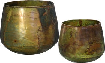 Storied Home Various Round Metal Planters with Oxidized Finish, Green, Set of 2, Main, color, Brass