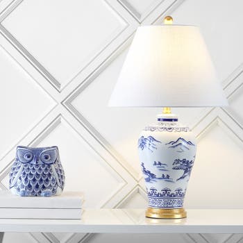 Our traditional Chinoiseries lamp features a blue and white landscape painting. Two lamps would make the perfect pair for a bedroom, living room, or entry console. It has a classic ginger jar shape for a traditional look, and brass fittings to satisfy your inner Maximalist. Includes an energy-saving LED bulb.