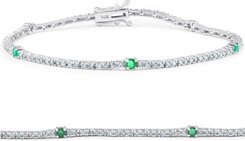 This women's bracelet features round brilliant cut diamonds and five green emeralds. All diamonds and gemstones are prong set in a solid 14k white gold double locking clasp setting. The bracelet measures 7" long and approx 1.7mm wide.