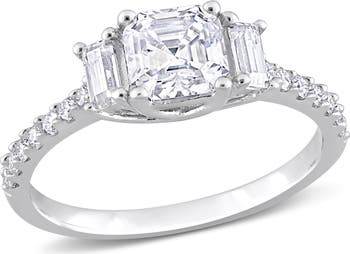 Elevate your style with this Baguette-Cut and Octagon Asscher-Cut Created Moissanite Three Stone Ring. The exquisite combination of sleek baguette and octagon cuts creates a striking design that radiates sophistication. Perfect for adding a touch of elegance to any occasion, this ring is crafted in sterling silver for a timeless, luxurious look.