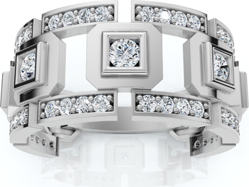 Bold and masculine, this 1 1/4Ct men’s diamond wedding band is designed to stand out. Crafted in 10K white or yellow gold, it features a striking geometric layout with a central bezel-set round lab-grown diamond, framed by additional diamonds set across sculpted, segmented links. The structured design delivers a modern, industrial edge while maintaining refined brilliance from every angle. Multiple rows of diamonds add depth and sparkle, balanced by solid gold elements for durability and comfort. Perfect for the man who wants more than a traditional band, this ring combines strength, style, and contemporary luxury—an unmistakable statement of commitment.