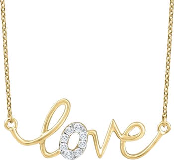 This fashionable women's love pendant features 8 round lab grown diamonds. All diamonds are set in 10k yellow gold. An 18" 10k yellow gold clasp lock chain is included. Pendant is 5/8 inch wide.