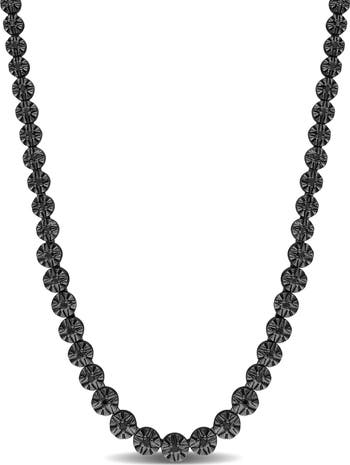 This wondrous black diamond tennis necklace is ideal for anyone who wants to add a bit of glitz to their style. This stunning necklace is crafted in glistening sterling silver and features 37 round-cut, prong-set black diamonds in a tennis pattern for a bold and stylish look. Polished to a brilliant shine, this appealing neck piece measures 17-inches in length.
