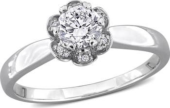 Bring feminine glamour to your everyday look with this beautiful floral engagement ring. Featuring a round-cut, 6-prong-set lab-grown diamond at the center with pave-set lab-grown diamonds along the halo design crafted in 18k white gold. This beautiful ring is enhanced with a high polish finish.