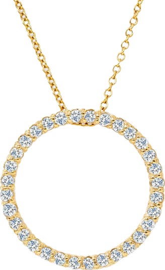 This popular circle of life pendant features round brilliant cut lab grown diamonds. All diamonds are prong set in 10k yellow gold. The pendant includes an 18" 10k gold lock chain. Pendant is 3/4 inch tall.