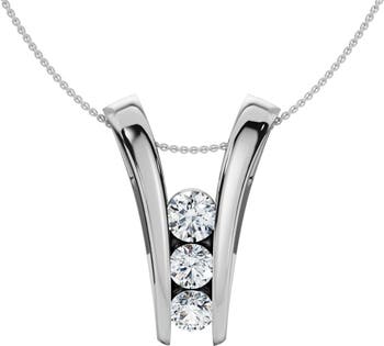 This classic and stunning women's necklace features three round brilliant cut lab grown diamonds. All diamonds are prong set in solid 10k gold polished cast mounting. An 18" 10k gold spring ring chain is included.