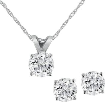 This classic solitaire set includes a matching lab grown diamond pendant and stud earrings, each crafted in solid 14k gold. The diamonds are bright, well-cut, and full of fire, graded G-H in color and VS2-SI1 in clarity for an elegant, everyday sparkle. The pendant features a timeless four-prong setting on a delicate white gold chain, paired with matching four-prong stud earrings for a coordinated look. A perfect gift set with exceptional value and quality.