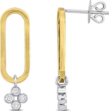 These stylish dangle earrings are crafted in lustrous 14-karat two-tone white and yellow gold. These exquisite earrings feature eight bezel-set diamonds arranged in a flower-like pattern. Enhanced with a high polished finish, these captivating earrings are comfortably secured with butterfly closures. These statement earrings are perfect for getting a trendy party look.
