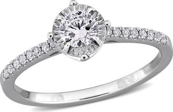 Add some stunning sparkle to your look with this stylish halo ring. Featuring round-cut lab-grown diamonds crafted in 18k white gold. This lovely ring is enhanced with a high polish finish.