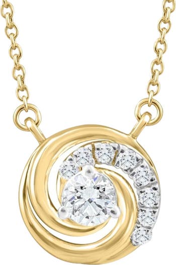 This popular circle of life pendant features eight round brilliant cut lab grown diamonds. All diamonds are prong set in 10k yellow gold. The pendant includes an 18" 10k gold clasp lock chain. Pendant measures 10mm wide. 25mm = 1".