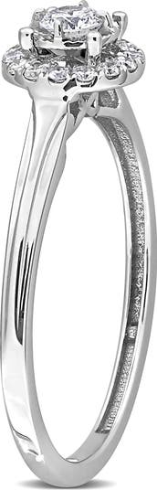Present your loved one with this charming halo ring. Featuring a round-cut lab-grown diamond at the center surrounded by a halo of 15 lab-grown diamonds on an elegant band crafted in 18k white gold. This pretty ring is enhanced with a high polish finish.