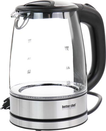 The Better Chef 1.7 Liter 360 Degree Glass Cordless Electric Kettle is ready to help kick start your mornings. This single 7 cup kettle comes in a sleek glass and stainless steel design that will accommodate any kitchen. It boils water faster than a standard stove top or microwave. With its stain-resistant borosilicate glass, cleanup is a breeze. Brighten up your day with the kettle's blue LED base! Item Dimensions: 9.75" x 9.25" x 6.50" Item Weight: 2.20lbs