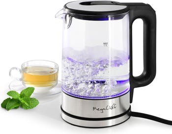 The MegaChef 1.8 Quart Glass Electric Tea Kettle-a stunning fusion of style and innovation designed to elevate your tea and coffee brewing experience. Crafted with high-quality borosilicate glass, this electric kettle not only offers durability but also provides a visual delight as you watch water boil. With a generous 1.8 Quart capacity, it's perfect for serving multiple cups, whether you're entertaining guests or enjoying a peaceful moment alone.Equipped with a powerful heating element, this electric kettle rapidly boils water, saving you precious time and energy. Its ergonomic handle ensures comfortable pouring, while the 360-degree swivel base offers convenience and flexibility, allowing you to lift and pour from any angle with ease. Safety is paramount, and the MegaChef Glass Electric Tea Kettle features built-in auto shut-off and boil-dry protection, providing peace of mind and preventing accidents. Elevate your kitchen aesthetics while enjoying the convenience and efficiency of the MegaChef 1.8 Quart Glass Electric Tea Kettle-a perfect blend of form and function for any modern home.