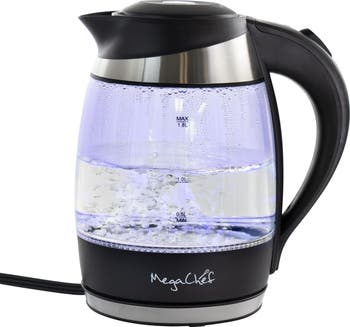 Make all your favorite hot beverages and more with the Mega Chef 1.8Lt. Glass Stainless Steel Electric Tea Kettle. This kettle has a sleek design with a stainless steel finish that looks great in any kitchen. See when your water is boiling with the clear glass construction. Heat up water worry free with the auto shut off feature! Clean up is a breeze with the removable and washable filter, and worry less about messes with the drip-free spout.