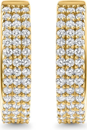 This classic pair of matching earrings features 54 round brilliant cut lab grown diamonds. All diamonds are prong set in 10k yellow gold. The earrings are secured with vault lock snap clasps. The earrings measure 3/4" tall which is the perfect every day size.