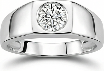 High quality men's ring features a large one carat round brilliant cut genuine lab grown diamond. The diamond is bezel set in solid white gold high polished durable mounting.