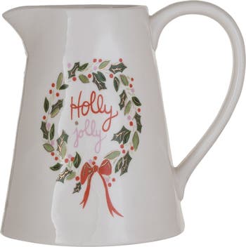 - A festive stoneware pitcher with gold electroplating and a "Holly Jolly" inscription, bringing holiday sparkle to the table