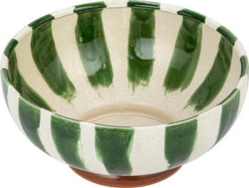 - Elevate the table setting with this stunning 10.25-inch round hand-painted stoneware footed bowl with an intricate striped design in shades of green, white, and brown